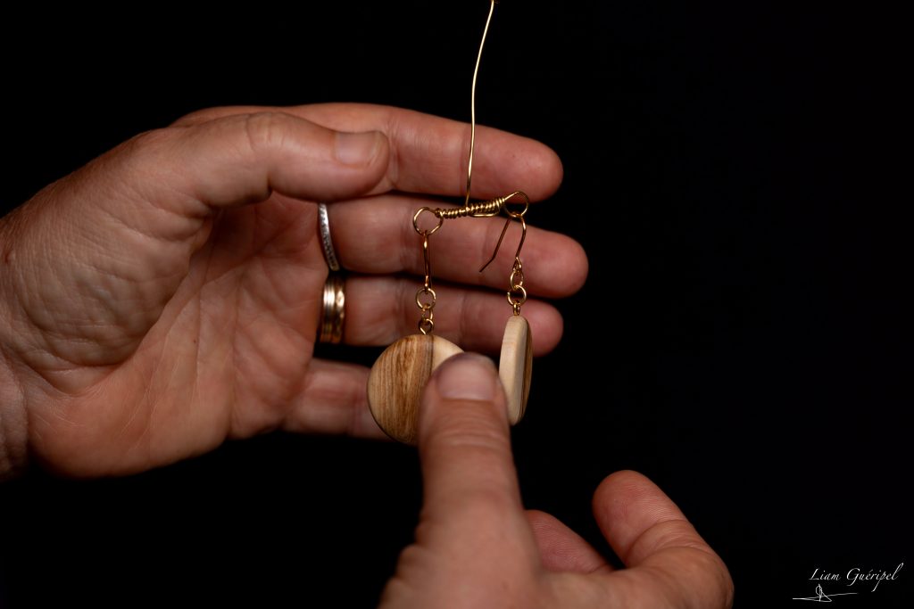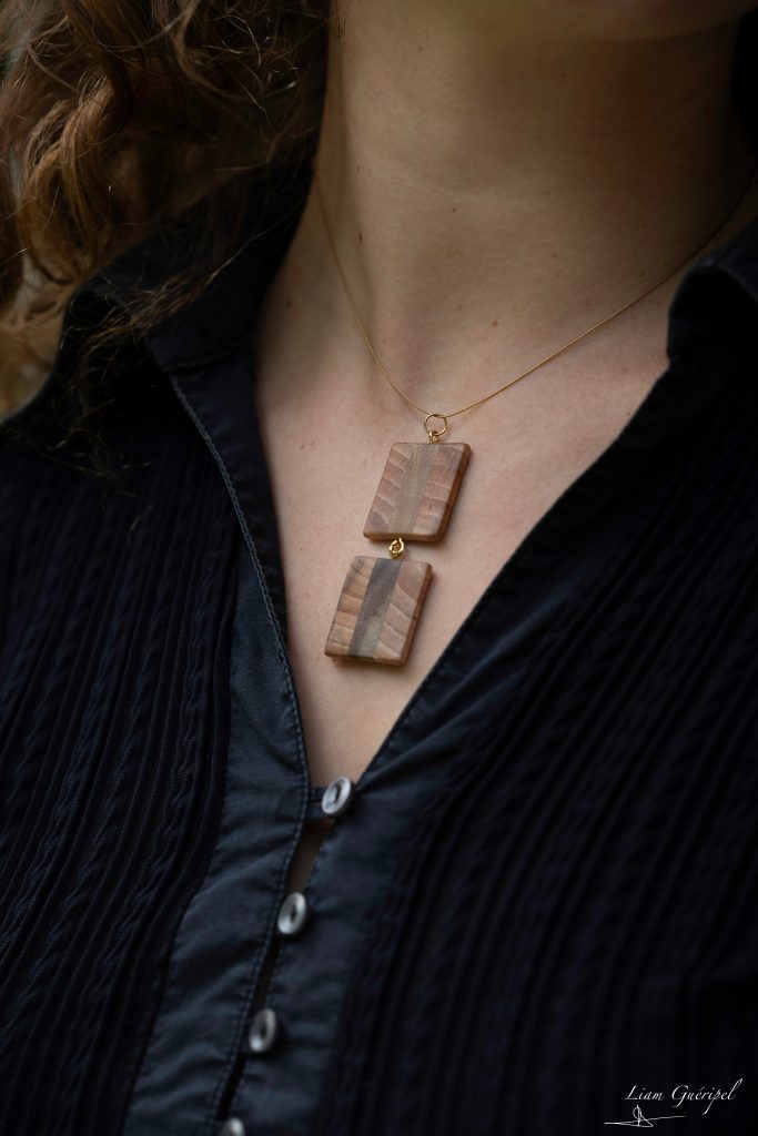 Je travaille à partir de morceaux, de chutes, que je sélectionne avec soin et que je transforme en bijoux — en laissant parler leurs grains, leurs teintes, leurs nœuds, leurs singularités.